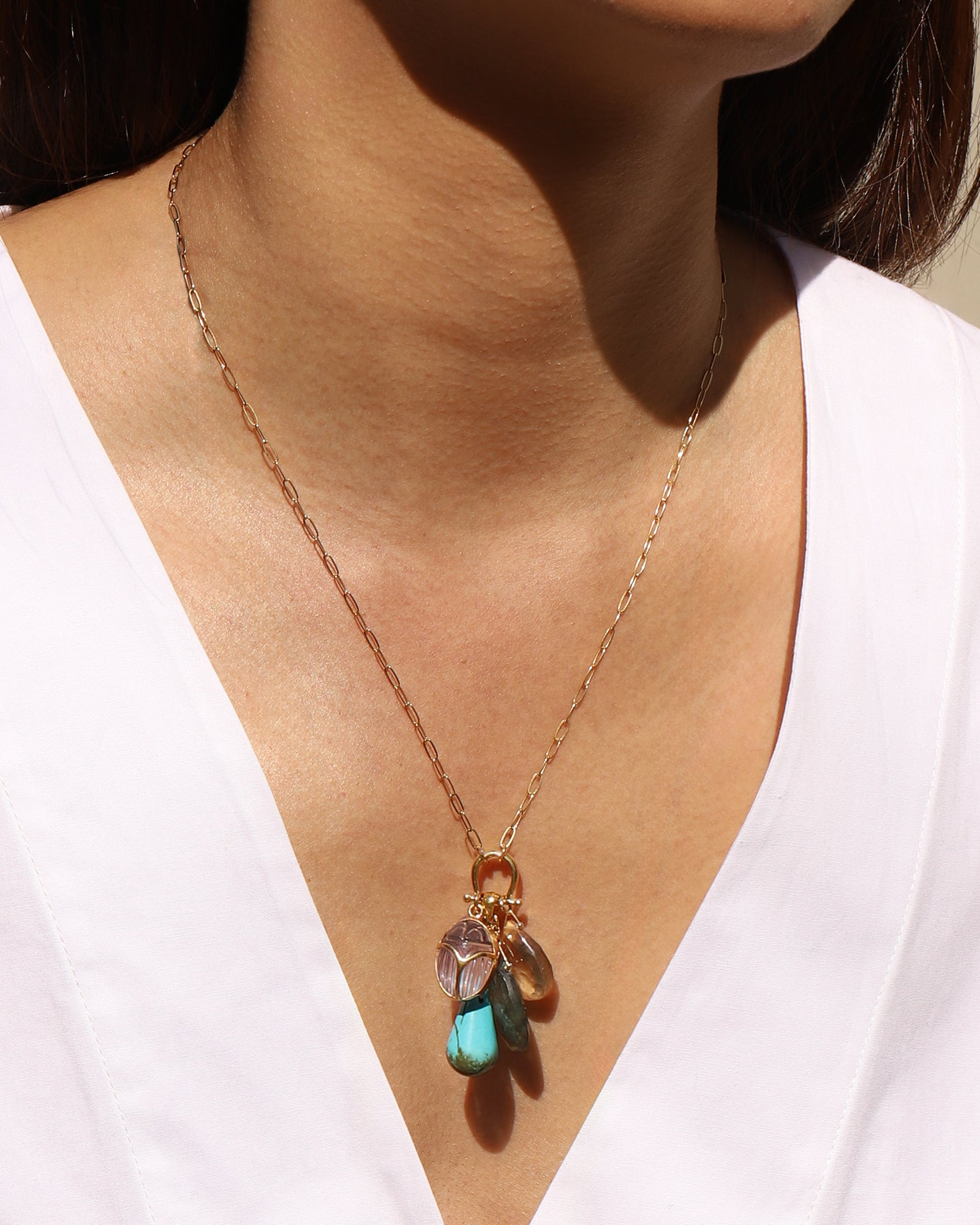 A sophisticated take on the classic heart pendant from Chan Luu. A translucent crystal heart is suspended from an 18k gold-plated sterling silver chain. Fastens with an adjustable ring clasp closure. Timeless, subtle, and goes with everything