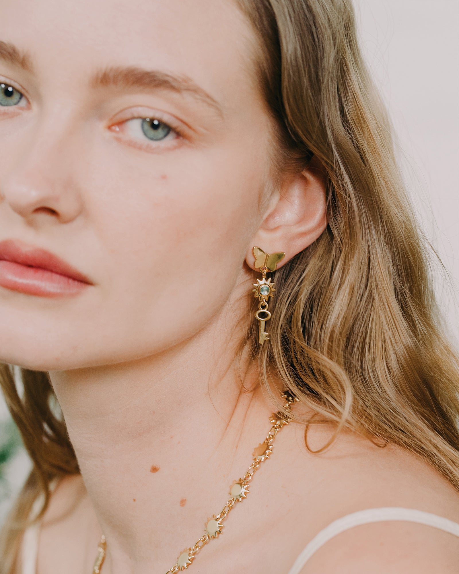 Playful and full of charm, the Alice Earrings feature a drop design with a butterfly, a sun charm set with a sky blue CZ cabochon, and a delicate key. This whimsical trio creates a unique statement with soft movement and shine.
