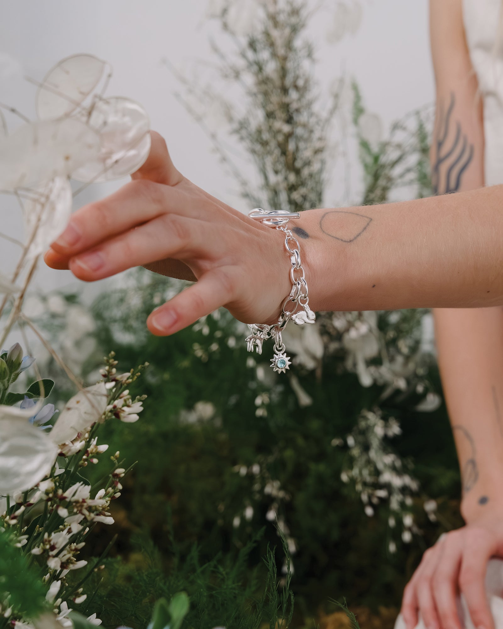 The Lucy Charm Bracelet comes pre-assembled with the Lucy bracelet and four charms — Alba, Bunny, Lamb, and Key, each attached with a hinged link for easy movement and styling.