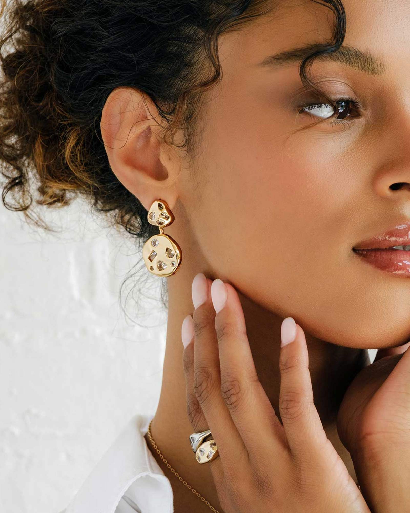 Two organic forms in motion, scattered with gems that shimmer as they sway. They’re not just earrings, they’re a shift in energy — the instant elevation that makes you walk into the room differently.
