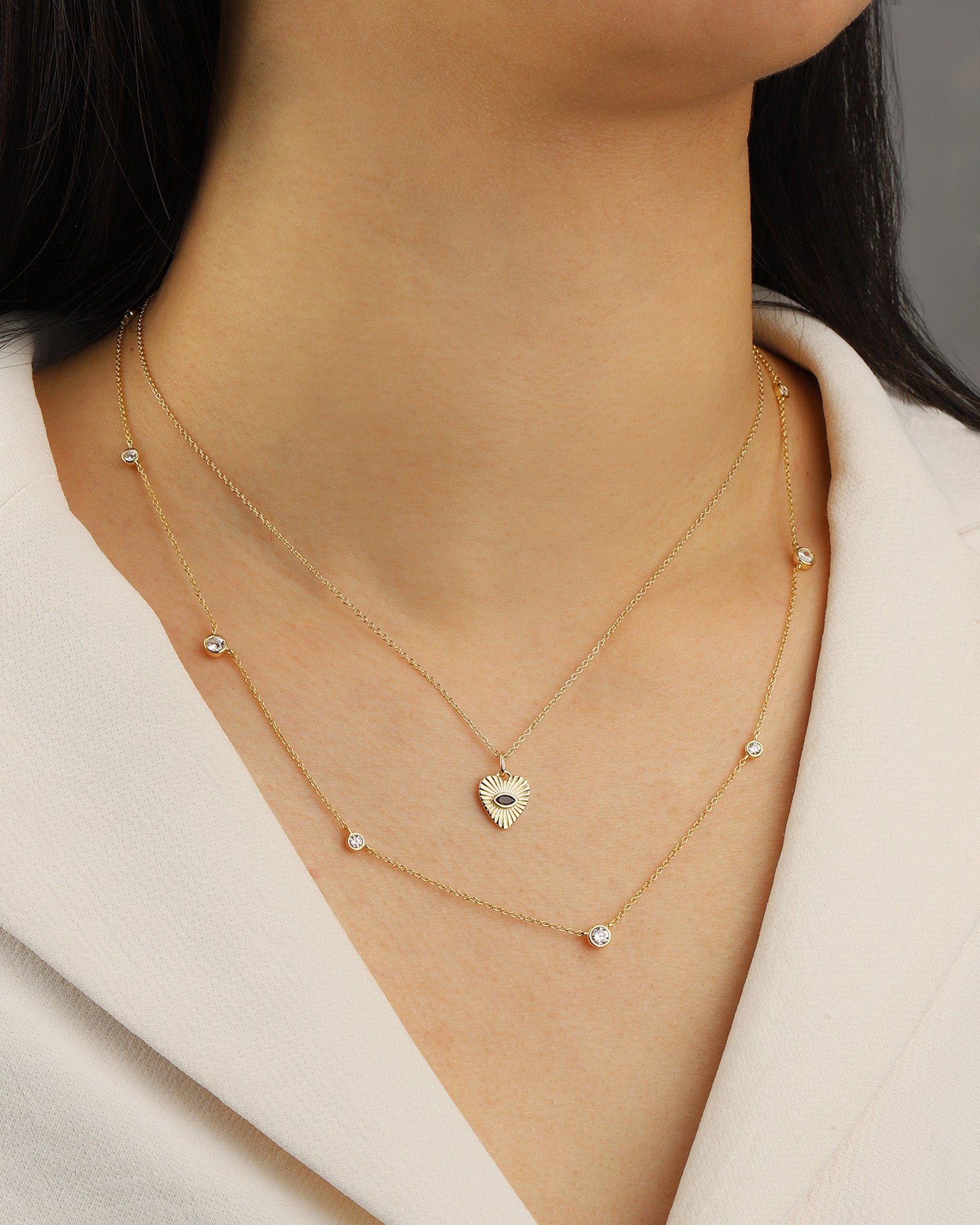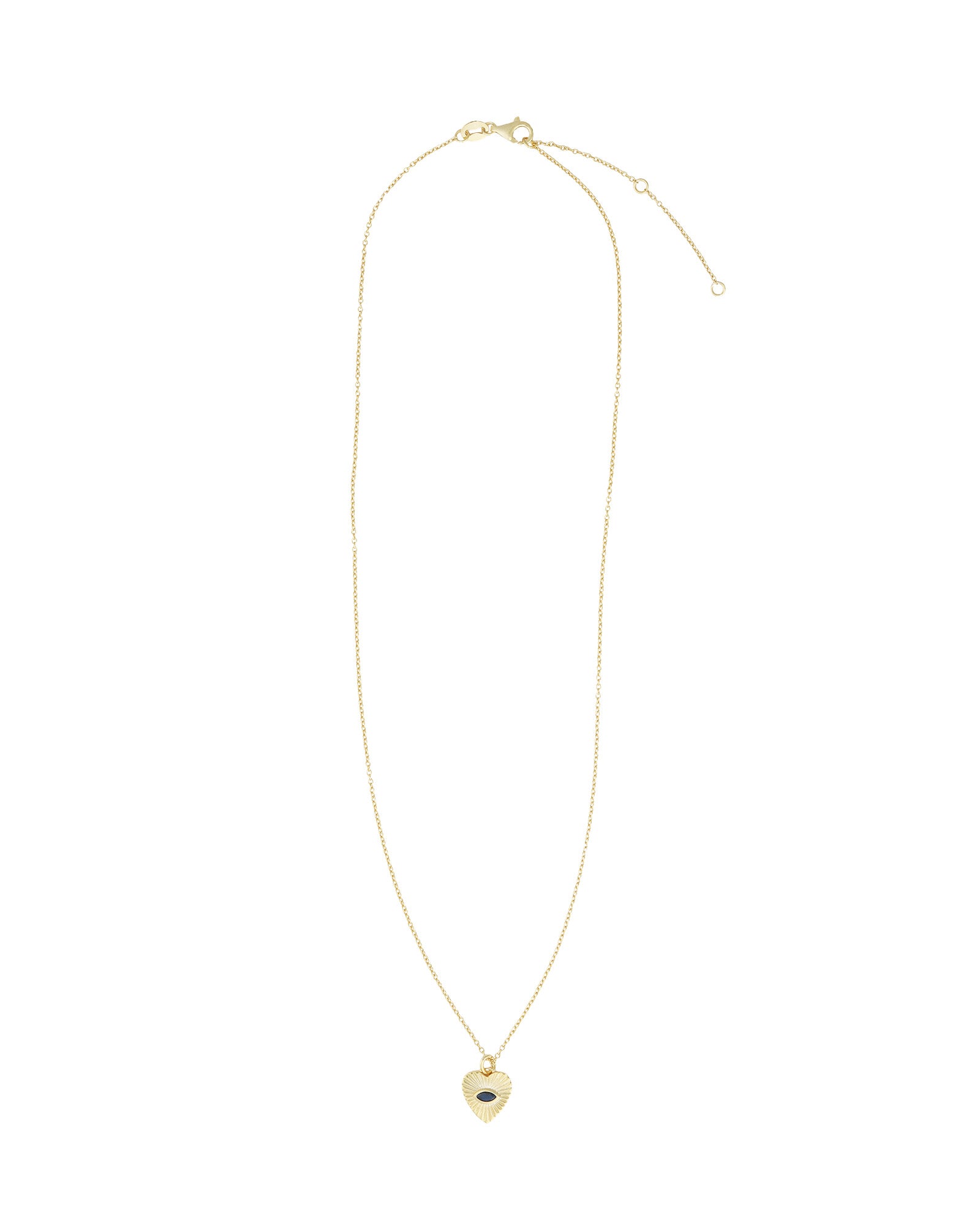 A protective symbol with a radiant twist, the Radiant Heart Evil Eye Necklace features a heart-shaped pendant with grooved sunburst detailing and a sparkling blue sapphire CZ centre. Suspended from a delicate chain, it adds subtle shine and meaning to your everyday layers.